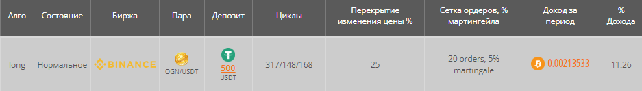 При условии, что бот торговал на паре OGN/USDT с 10 августа по 10 октября 2023 года, с алгоритмом LONG, получились следующие результаты: